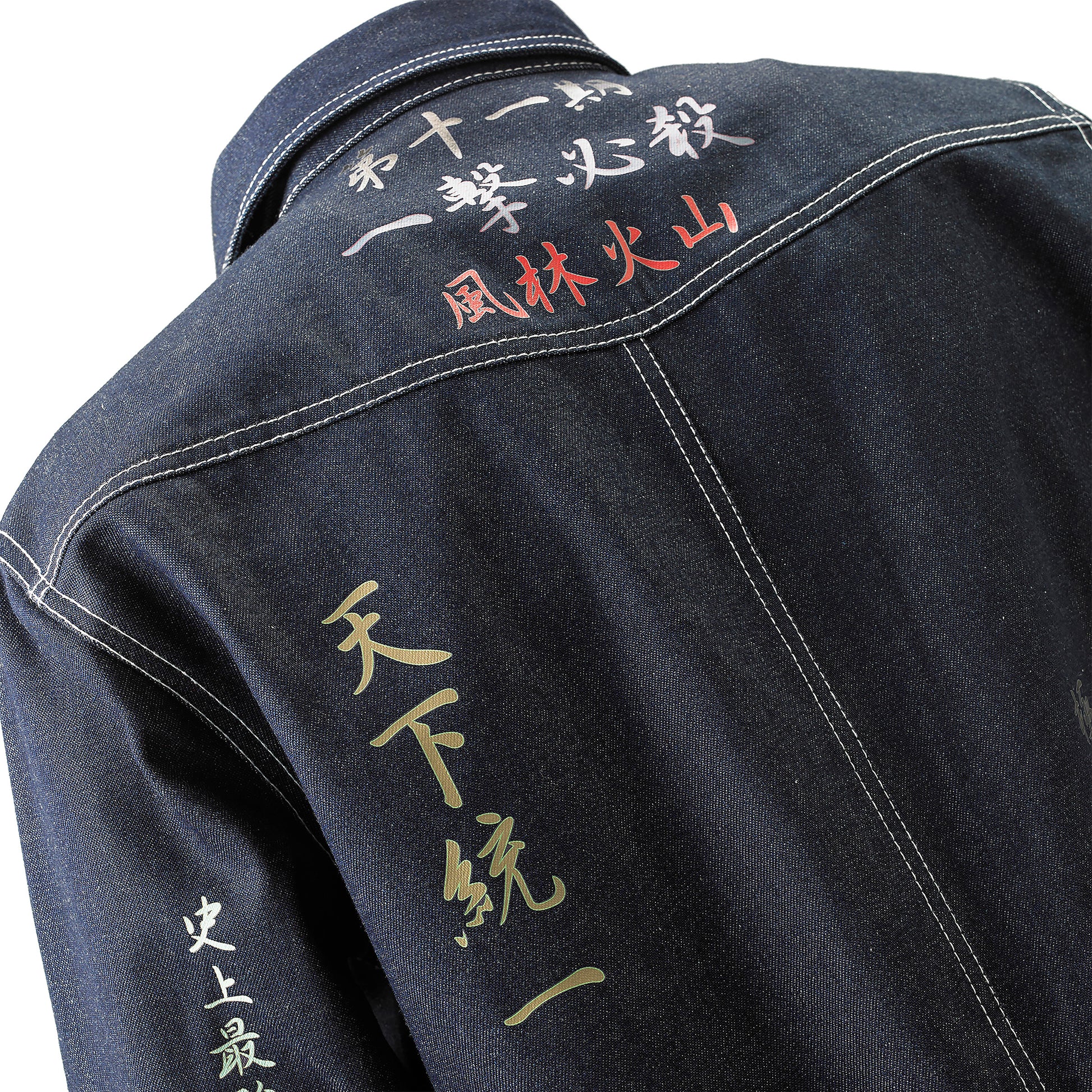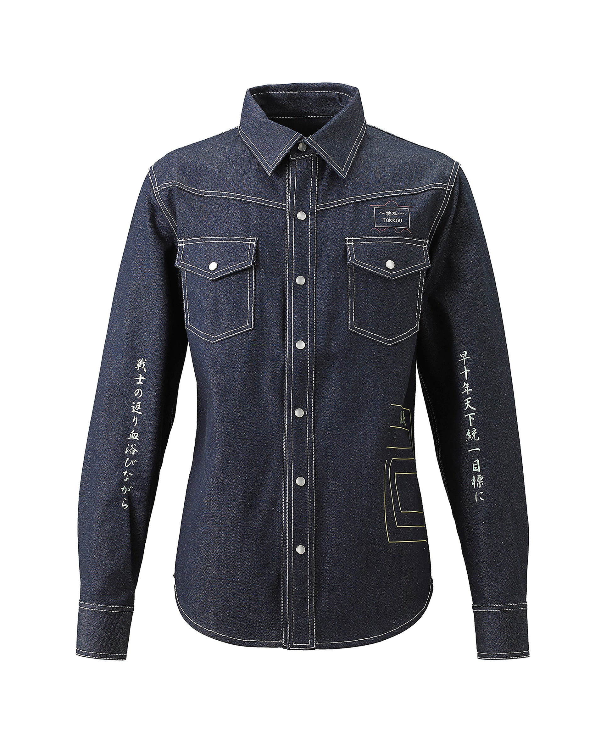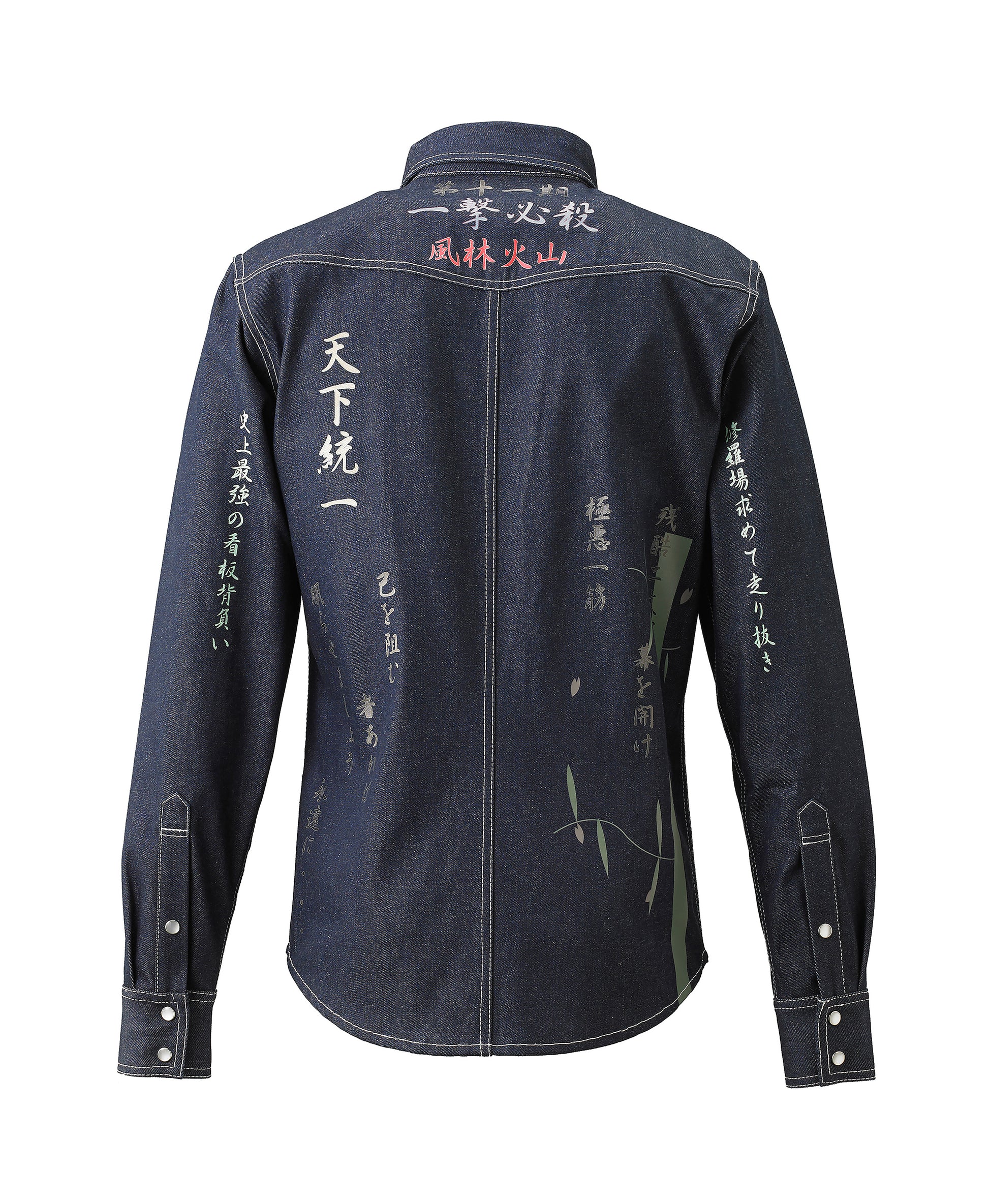 ブランドアイコンの「竹」と「天下統一」のバックプリントの入ったウエスタンタイプのシャツ。デニムは岡山でコットンから縫製まで全て行っています。デニムのオンスは11.5ozを使用。